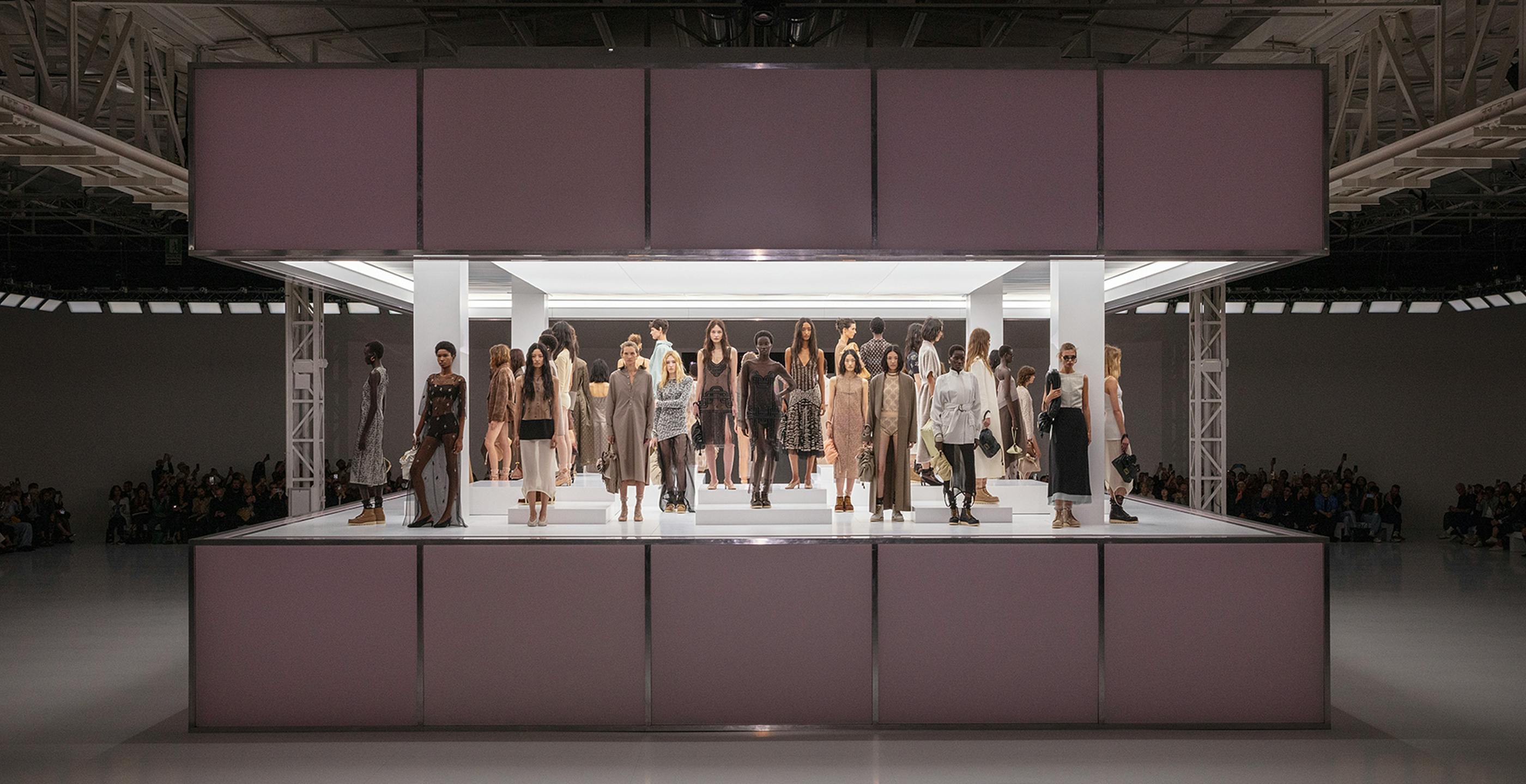 En tant que Maison transmise de génération en génération par des personnalités puissantes, Fendi n’a de cesse d’incarner des histoires de femmes actives et libres de leurs mouvements grâce aux vêtements et accessoires. La palette alterne entre des teintes beige rosé et marron glacé, des verts d’eau et des blancs écrus. Des robes inspirées des formes années 1920 sont finement brodées à la main, redoublant de légèreté grâce aux effets brillants et transparents tandis que les motifs floraux éclosent au fil de la collection. Comme enfilés à la sortie du lit, robes chemises, longs peignoirs ou mini shorts évoquent une simplicité raffinée. Ce mélange de prêt-à-porter et d’esprit haute couture tourbillonne entre soie, organza et cuir.